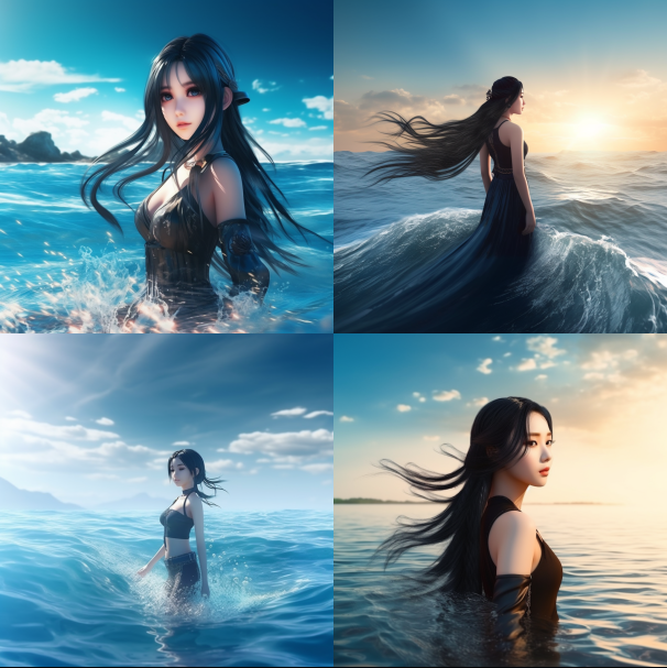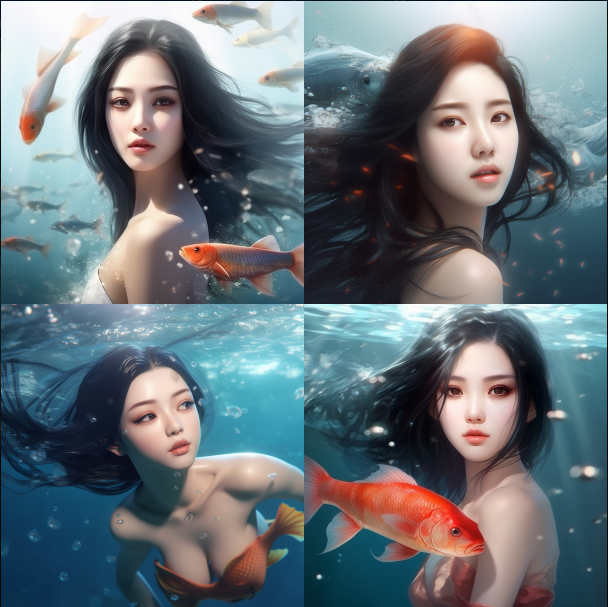 显然,上面的Prompt在图片生成过程中只能根据关键词进行拼接生成,并无法产生我们想象中美人鱼的样子,即便将Prompt做进一步的细化描述: