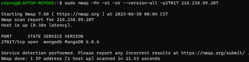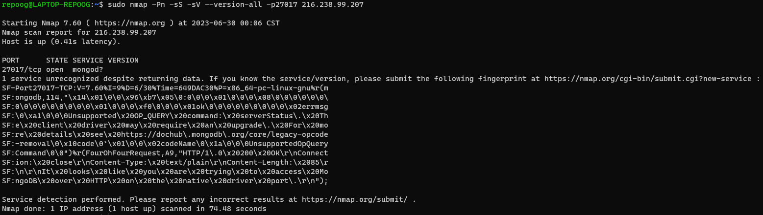 如上图所示,对应的VERSION信息是空,在提示信息中可以看到,官方推荐将指纹信息上传以帮助更新服务指纹,又或者可以通过Nmap的默认脚本mongodb-info来做版本识别。前一种方式需要等待官方做指纹文件更新或产品版本更新,后者使用脚本又会影响到扫描速度。如果想在当前的Nmap版本下不使用脚本来识别MongoDB 6.0以上版本,唯一的办法是使用Nmap内置的服务指纹将MongoDB 6.0服务版本识别出来。