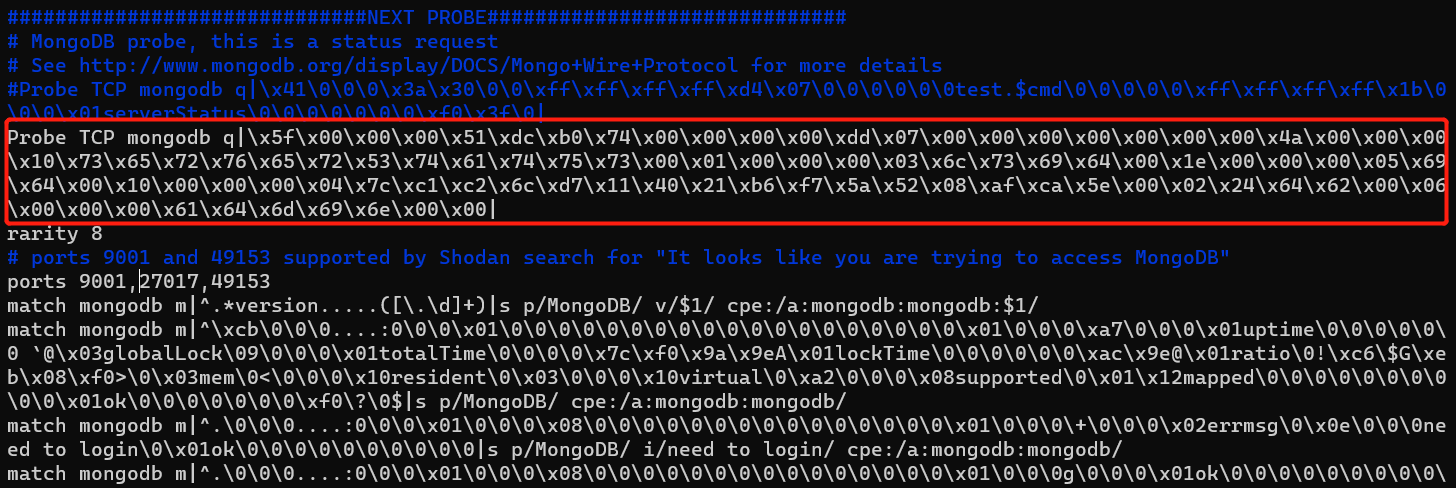 知道MongoDB 5.0.1版本的指纹识别方式,以及MongoDB的OP_MSG消息格式,便可以通过抓取MongoDB 6.0的版本信息请求的流量,修改Nmap的服务探针文件nmap-service-probe来识别服务版本。