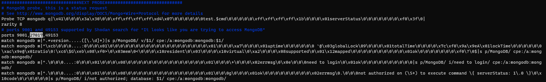 Nmap默认的服务指纹文件位于/usr/share/nmap目录下,文件名是nmap-service-probes,根据默认端口27017可以找到Nmap识别MongoDB服务的内容: